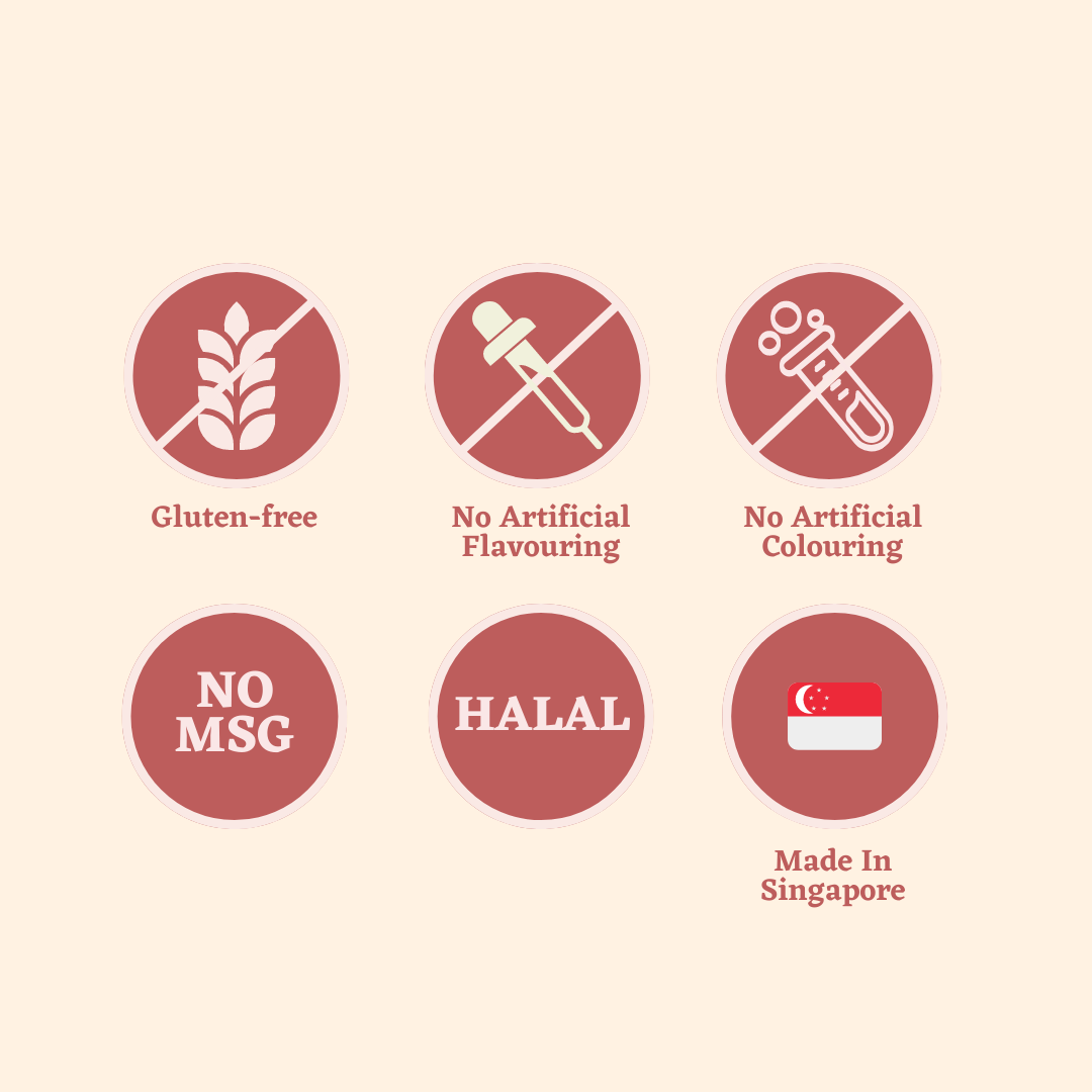 Properties: Halal, No Artificial Colouring or Flavouring, No Gluten, No MSG.